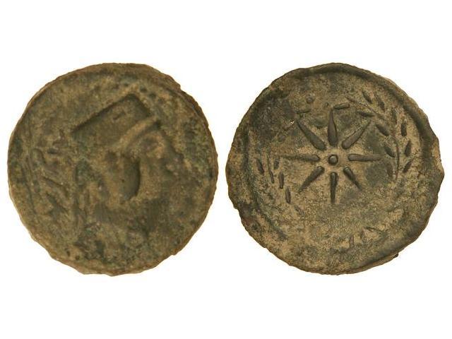 Semis. MALACA. Anv.: Cabeza de Vulcano a derecha con gorro plano, detrás tenazas y leyenda neopúnica y resello. Rev.: Estrella de ocho puntas. 7,70 grs. Anverso similar G.G.-38 pero de cuello muy corto y reverso similar al anterior. Pátina v