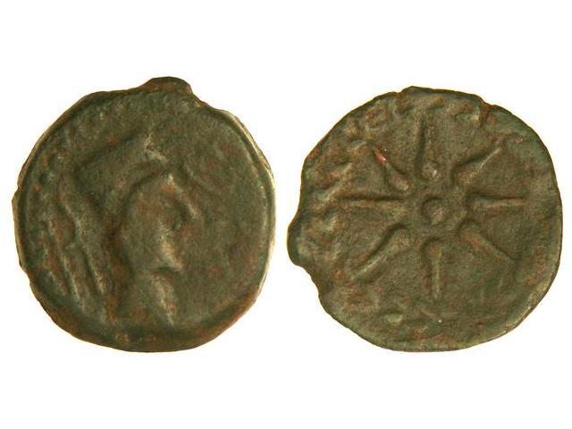Semis. MALACA. Anv.: Cabeza de Vulcano con gorro plano a derecha, delante leyenda y detrás tenazas. Rev.: Estrella de ocho rayos. 5,70 grs. Similar a G.G.-63 pero de cabeza más pequeña y arte más degenerado. Últimas emisiones. MUY RARA. AB-1