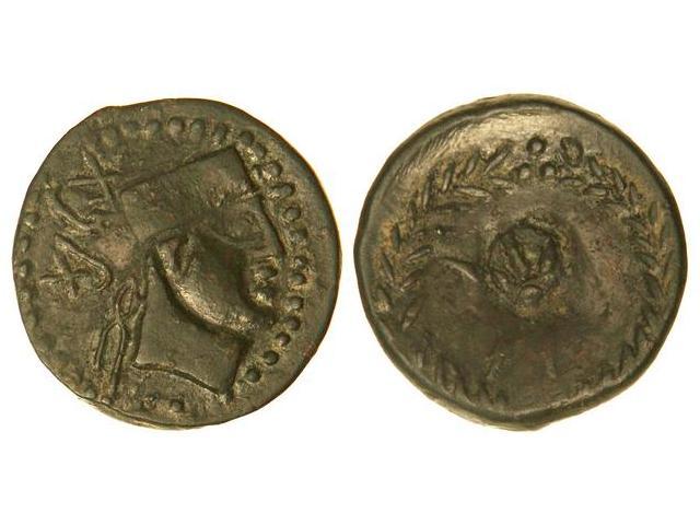 Semis. MALACA. Anv.: Cabeza de Vulcano con gorro plano a derecha, detrás tenazas y leyenda neopúnica. Rev.: Estrella de ocho puntas y resello. 6,40 grs. Anverso similar al G.G.-39 pero de cuello largo y ancho y reverso similar al anterior. P