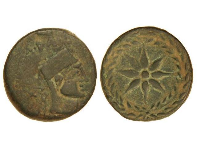 Semis. MALACA. Anv.: Cabeza de Vulcano con gorro plano a derecha, detrás tenazas y leyenda neopúnica. Rev.: Estrella de ocho puntas. 7,10 grs. Variante de estilo. Pátina verde. AB-1733 var.; G.G.-58. MBC/MBC+.