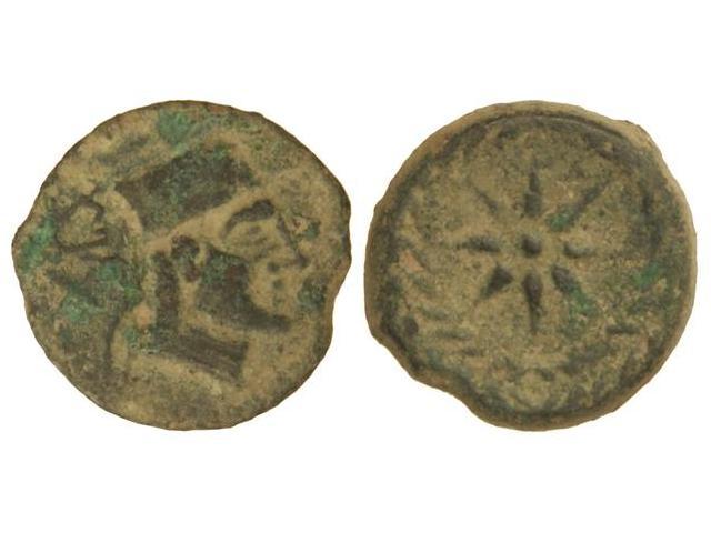 Semis. MALACA. Anv.: Cabeza de Vulcano con gorro plano a derecha, detrás tenazas y leyenda neopúnica. Rev.: Estrella de ocho puntas. 6,60 grs. Pátina verde. AB-1733; G.G.-38. MBC.