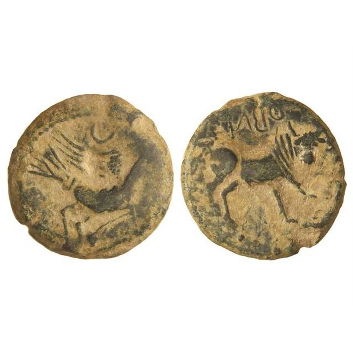 Semis. - OBULCO. - Anv.: Águila con alas desplegadas a derecha, encima creciente. Rev.: Toro a derecha encima al aire ley. externa: OBVLCO. 6,8 grs. Pátina verde. Vill-64. MBC-. - -