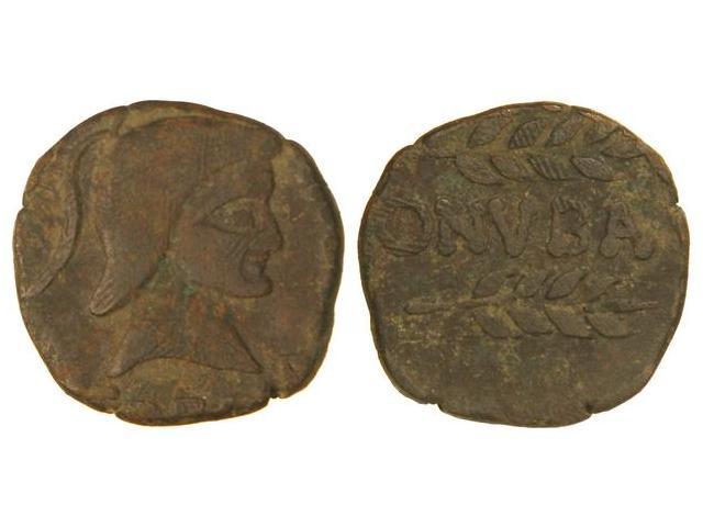 Semis. ONUBA. Anv.: Cabeza masculina con casco a derecha. Rev.: Dos espigas a izquierda, entre ambas ONVBA. 5,90 grs. CU. Pátina marrón. MUY RARA. AB-1896. MBC+.