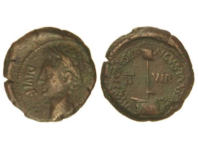 Semis. - ÉPOCA DE AUGUSTO. - CAESARAUGUSTO. - Anv.: (AVGVSTVS) DIVI. F. Cabeza laureada de Augusto a izquierda. Rev.: CAESAR AVGVSTA. L. CASSIO. C. VAL. FEN. II BIR. Véxilo. 8,10 grs. Pátina marrón. (Algo descentrada en anverso). AB-332. MBC-/MBC. - -