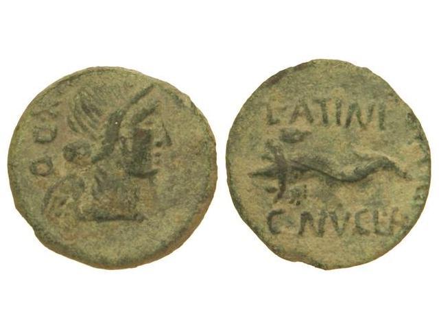 Semis. - ÉPOCA DE AUGUSTO. - CARTEIA. - Anv.: Cabeza de Victoria alada a derecha, detrás EX D. D. Rev.: Cornucopia encima L. ATINI., debajo C. NUCIA, a derecha (IIII VIR.). 5,61 grs. Pátina verde. AB-678; Vill-62. (EBC). - -