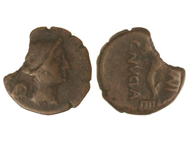 Semis. - ÉPOCA DE AUGUSTO. - CARTEIA. - Anv.: Cabeza de Victoria alada a derecha, detrás (EX D. D.). Rev.: (L. ATI)NI C. NUCIA III (VIR). Cornucopia. 5,60 grs. (Cospel faltado). AB-678; Vill-62, mismo ejemplar. (MBC-). - -