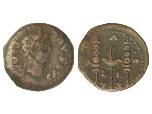 Semis. ÉPOCA DE AUGUSTO. EMERITA. Anv.: PERM. CAES. AVG. Cabeza laureada de Augusto a derecha. Rev.: LE. VX. (C.) A. E. Insignias y águila legionaria. 6,50 grs. Pátina oscura. AB-1016. BC+/MBC.