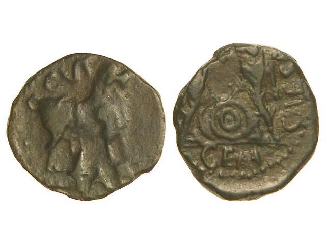 Semis. ÉPOCA DE AUGUSTO. TARRACO. Anv.: CAES(ARES) GEM. Cayo y Lucio de pie sosteniendo escudos. Rev.: Toro a derecha, encima C. V. T. debajo TAR(R.). 4,70 grs. Pátina verde. AB-2359. MBC.
