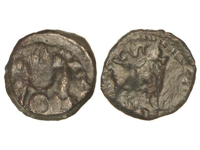 Semis. ÉPOCA DE AUGUSTO. TARRACO. Anv.: Cayo y Lucio en pie con escudos, alrededor CAESAR(ES GEM.). Rev.: Toro a derecha, encima C.V.T., debajo (TARR.). 4,21 grs. Pátina oscura. AB-2359. MBC+/MBC-.