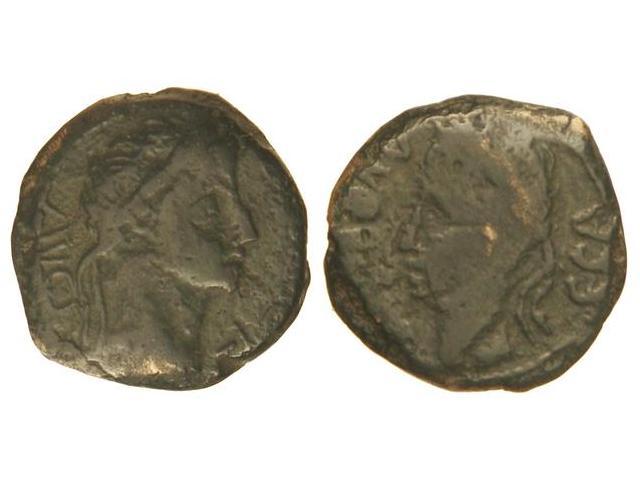 Semis. - ÉPOCA DE TIBERIO. - CAESARAUGUSTA. - Anv.: (Ti. CAESAR) AVG. Cabeza laureada de Tiberio a derecha. Rev.: AVG(VSTVS) C. C. A. Cabeza laureada de Augusto a izquierda. 5,40 grs. Pátina verde oscura. (Rayitas en reverso). AB-372. BC+. - -