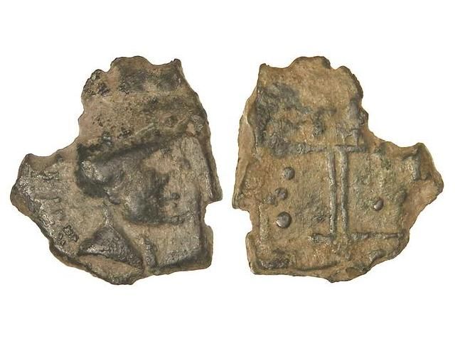 Semis. TIPO TEMPLO. Anv.: Cabeza masculina a derecha, detrás (ASIN. AED). Rev.: Templo. 4,21 grs. Llamadas también monedas del Torre del Bollo. Pátina verde. (Cospel irregular). ESCASA. Vill-1. MBC.