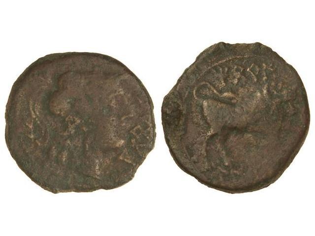 Semis. - UNTIKESKEN. - Anv.: Cabeza de Palas a derecha, delante ATABELS. Rev.: Toro a derecha, encima TIBERI, debajo leyenda ibérica. 8,50 grs. Pátina rojiza. AB-1225; Vill-46. BC+. - -