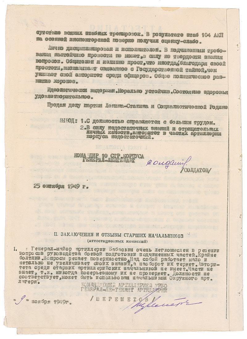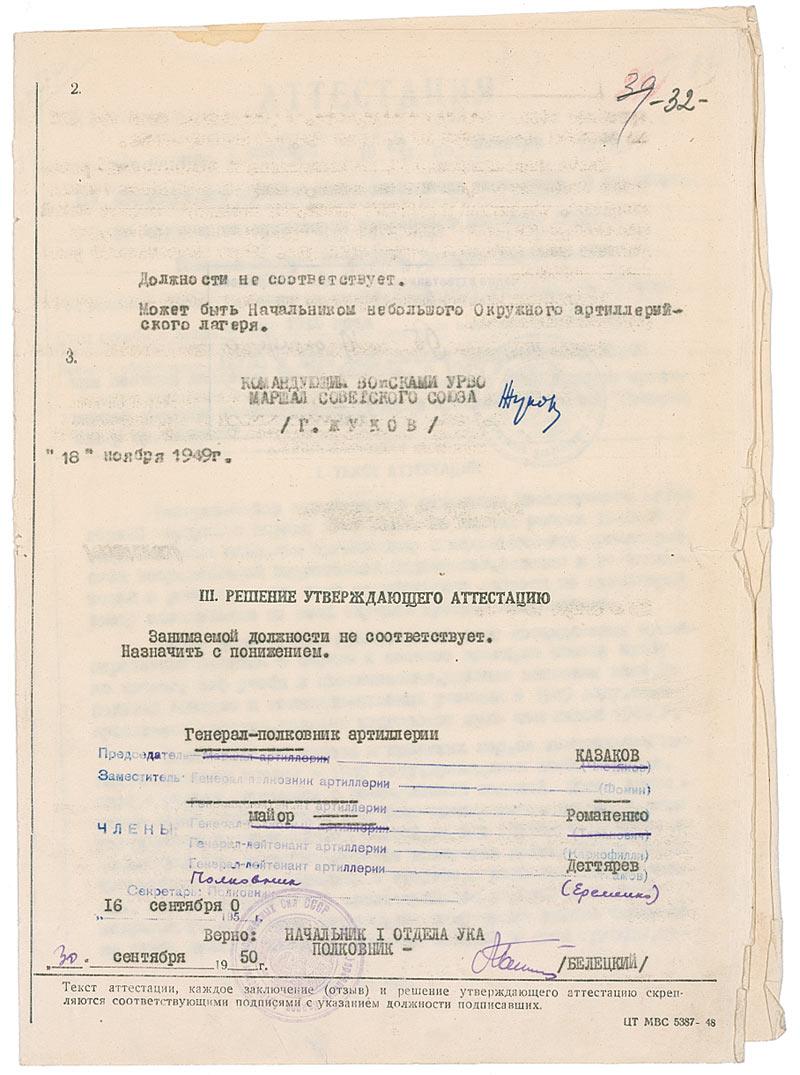 Soviet field marshal and Commander in Chief of the Southwestern Front. An inept leader, he allowed the German army to divide and nearly destroy his command. DS, in Cyrillic, signed by Budyonny at the top of the third page, four pages on two adjoining sheets, 8.25 x 11.75, 1949. Issued in the Ukraine for the Head of the Kiev Suvorov Cadet Academy. In very good condition, with wrinkling, creasing, and edge tears, light toning, and a few small binding holes.