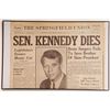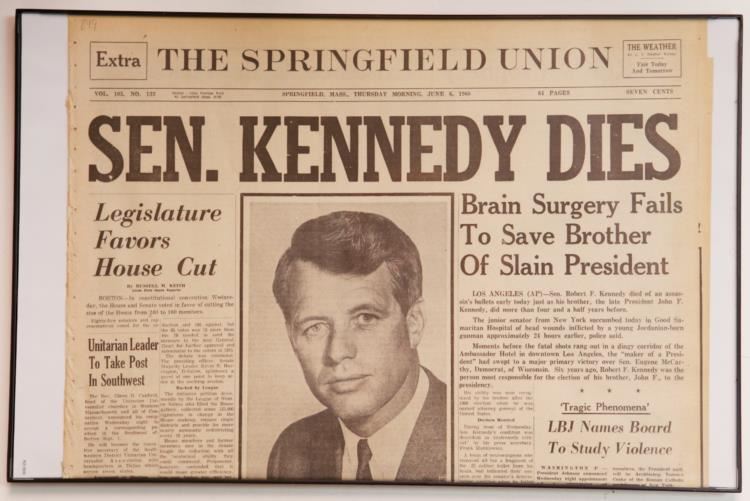 We present you with a framed front page newspaper headline from The Springfield Union (Massachusetts), "Sen. Kennedy Dies," published on June 6, 1968. This clipping is mounted in an 11" x 17" black frame and comes from an estate collection. This monumental news clipping would make a striking addition to any collection.