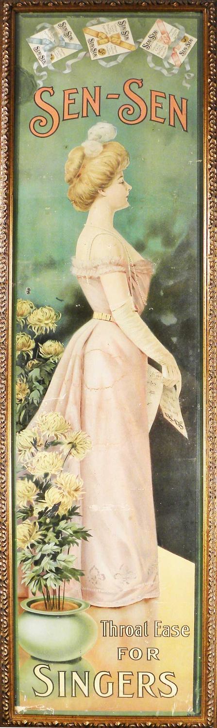 Sen- Sen Cardboard Sign. Entitled, "Throat Ease for Singers". Depicting woman singer. Dog ears on bottom corners, some staining and four holes across center other fair to good condition. 12 X 48 inches.