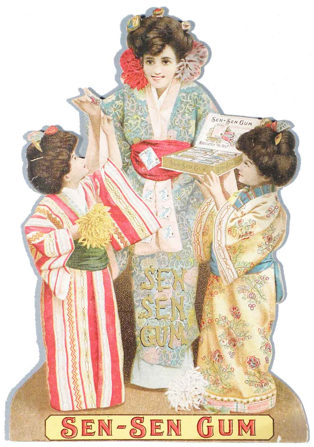 Sen-Sen Gum Die Cut Cardboard Sign. Depicting women with children in Asian dress. Framed under glass. Tiny rub on bottom right otherwise excellent condition. 4 3/4 X 7 inches image only.
