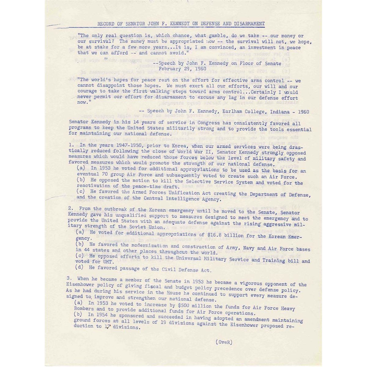 Original document from John F. Kennedy's Senate office, acquired from the Robert L. White collection. Two page memo outlines Senator Kennedy's record on defense and disarmament, characterizing it as hawkish, likely to position the Senator as a strong Presidential candidate. In part, ''When he became a member of the Senate in 1953 he became a vigorous opponent of the Eisenhower policy of giving fiscal and budget policy precedence over defense policy.'' Single sheet measures 8.5'' x 11''. Light crease to upper right corner, otherwise fine.
