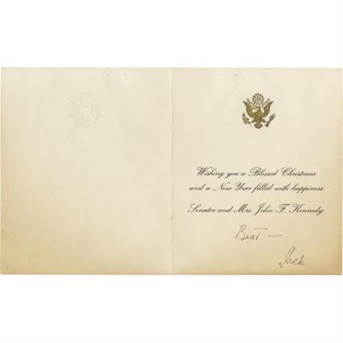 <B>Senator John F. Kennedy Christmas Card.</B></I> 4.7" x 5.75". With black-and-white portrait of John, Jacqueline, and Caroline with poinsettia and holly leaves along one edge. Inside a printed greeting reads: "Wishing you a Blessed Christmas and a New Year filled with happiness Senator and Mrs. John F. Kennedy" with a seal of the United States stamped in gilt above. An autopen signature below the greeting reads "Best - Jack". The front of the card has suffered significant toning and a former owner has annotated the back panel "Kennedy + Wife + Girl". There are a few minute pin holes at the top of the front panel and the bottom right corner is creased, else the card is in good condition. <BR><BR><BR><b>Shipping:</b> Flat Material, Small (<a target="_blank" href="http://www.heritageauctions.com/common/shipping.php">view shipping information</a>)