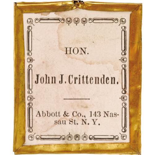 <B>Senator John J. Crittenden Tintype by Abbott.</B></I> Crittenden served as Attorney General under three Presidents: W.H. Harrison, Tyler, and Fillmore, as well as Kentucky Governor and United States Senator. This large tintype, with original identification card on reverse, was part of a set of prominent Americans produced in New York by Abbott circa 1862. Excellent condition, measures 1.375" x 1.625".