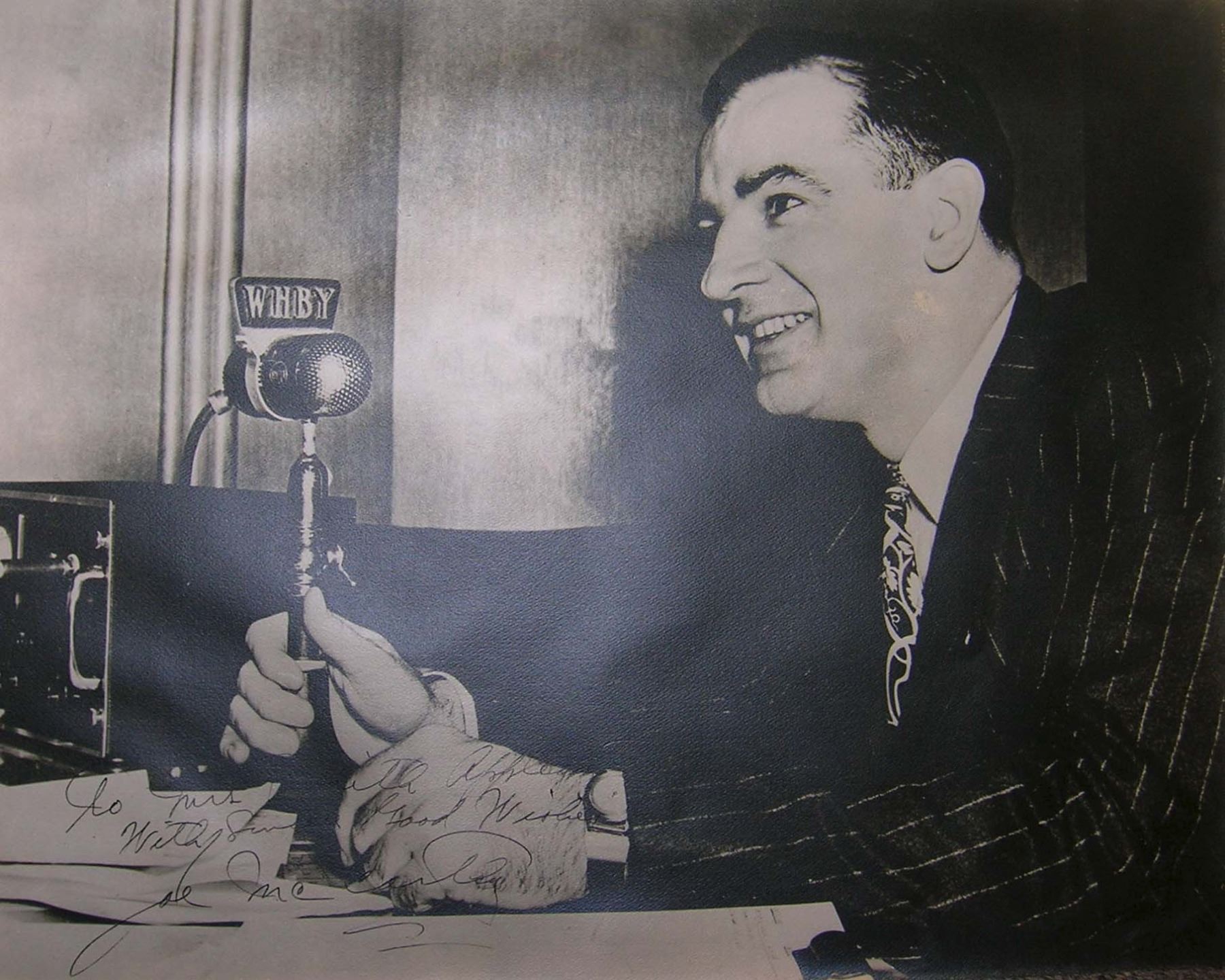 Large signed photo of Joseph McCarthy, showcasing the Senator's power of propaganda in front of a radio microphone. Black and white poster size photo bears the Senator's autograph inscription in black to the lower left, ''To Mrs. Dorith Applegate / With Sincere Good Wishes / Joe McCarthy''. Matte image measures 19.5'' x 15.5'', an interesting large size possibly for display in the home of a McCarthyite and today, as an ironic cautionary tale. Toning and pencil notations to verso and wear to edges. Near fine.