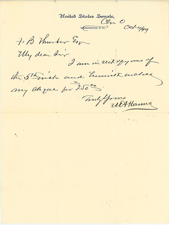 MARCUS HANNA. ALS. 1pp. 8" x 10". Clev O. Oct 7/99. An autograph letter signed "M A Hanna" on "United States Senate" letterhead. He wrote to "F B Thurber": "I am in rec't of your of the 5th inst and herewith enclose my cheque for $250.00". The letter has the usual folds with dark ink; it is in fine condition overall.
