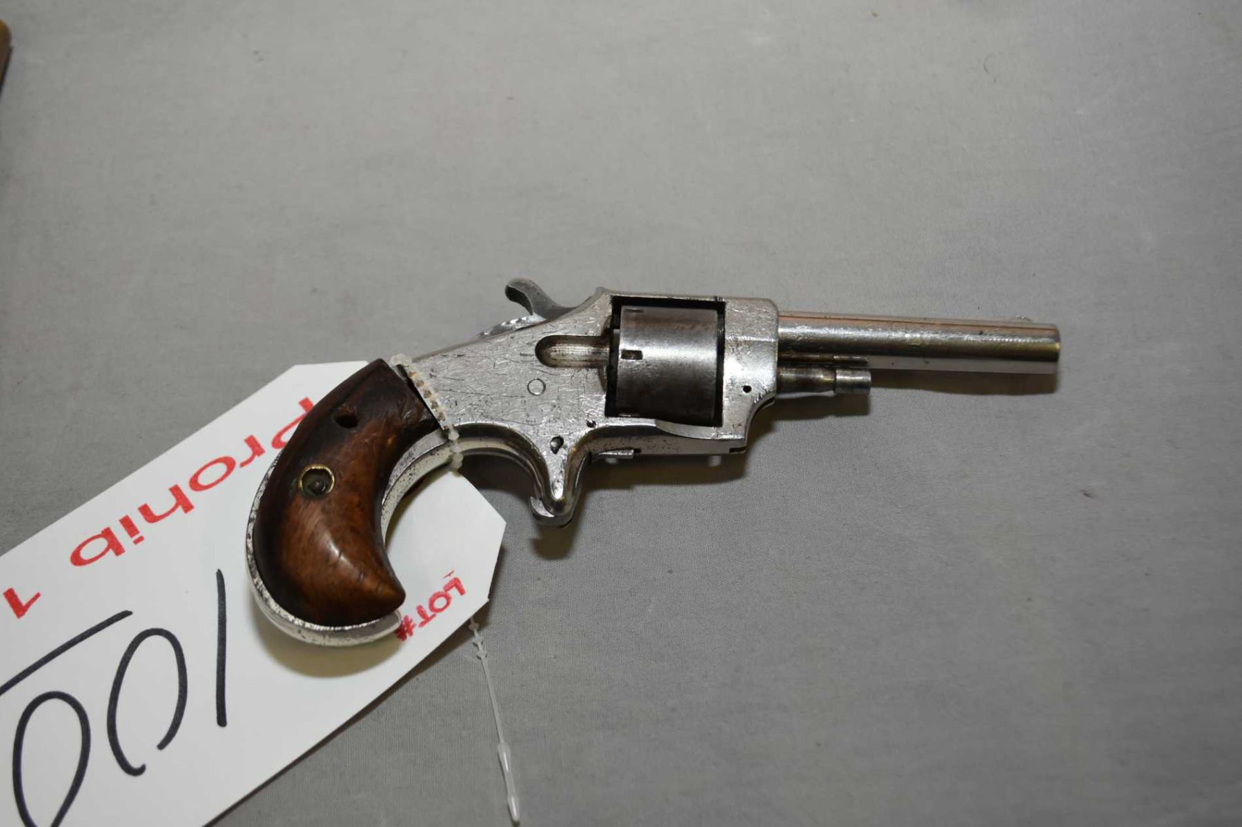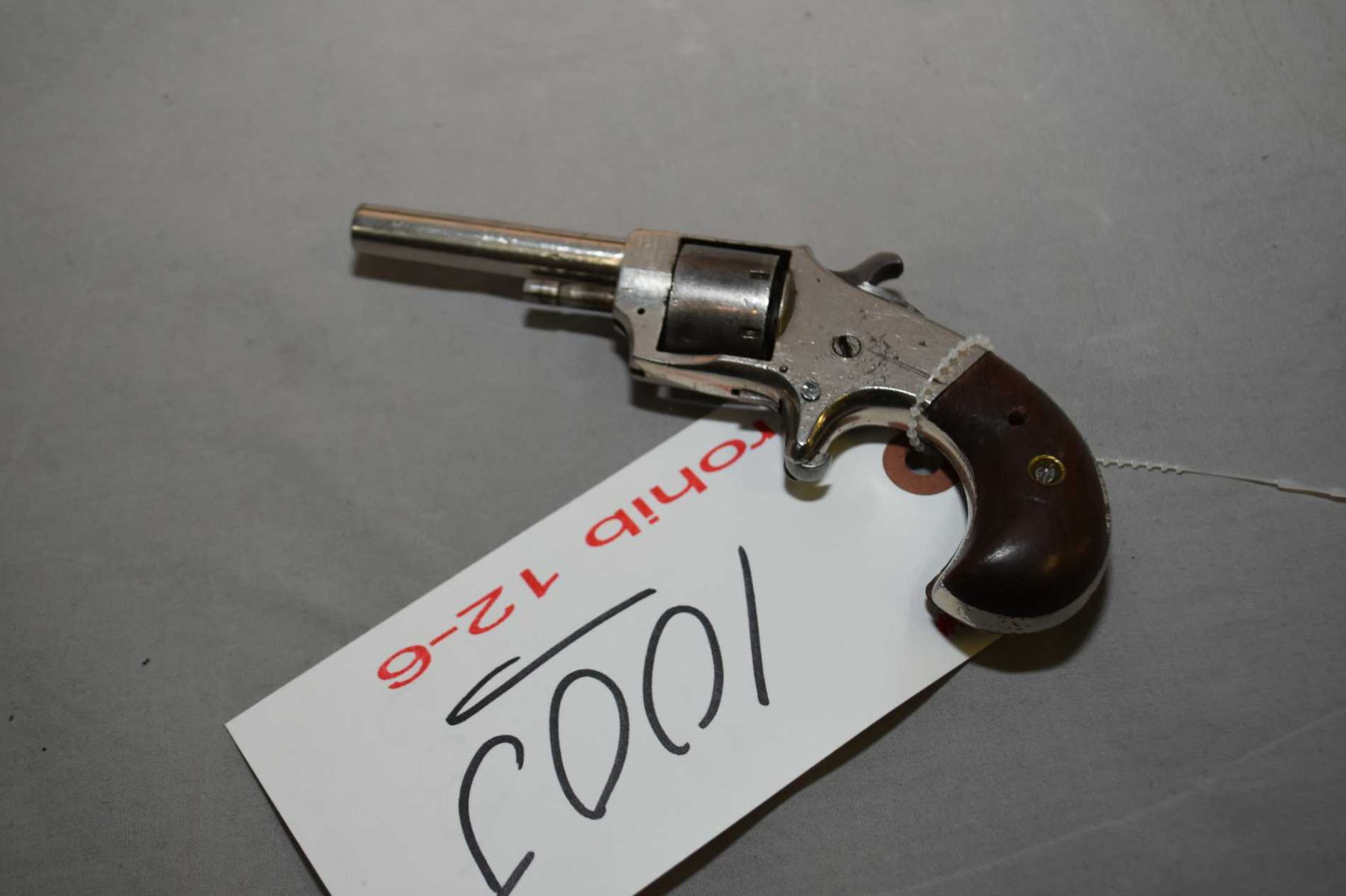 Senator ( Meriden Firearms Co. ) Model Senator No.1 .22 Rimfire Cal 7 Shot Revolver w/ 64 mm bbl [ nickel finish, some scratches and marks, fading cylinder, spur trigger, bird's head grips, both are chipped and have extra hole thru ] Ser # 21864 Prohib 12 - 6 Cert # 8749548 FRT # 34208 - 2 EXPECT DELAYS IN TRANSFER