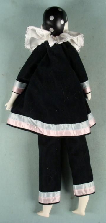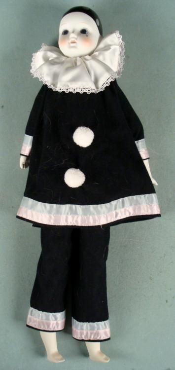 This is a lovely girl clown doll with hand painted porcelain head, arms, and feet, and fabric body. She is also a music box, and when you wind the key on back you'll here the tune "Send in the Clowns." Her outfit is black and white, with lace, satin, and felt. She is 23" tall. She is in excellent condition, aside from her left arm that has come unsewn. But a few threads should fix this up.. * This is a fine item for anyone who loves traditional clown dolls