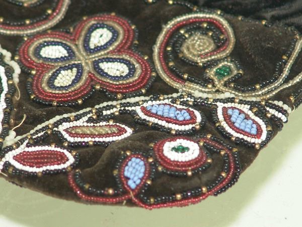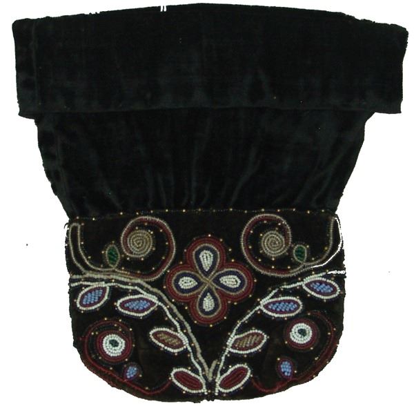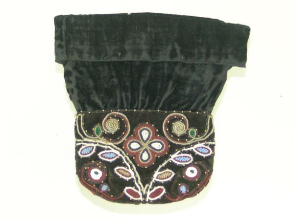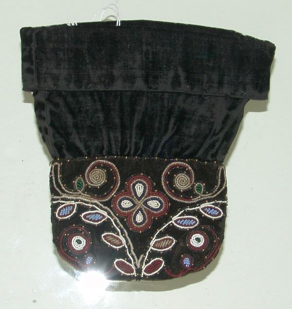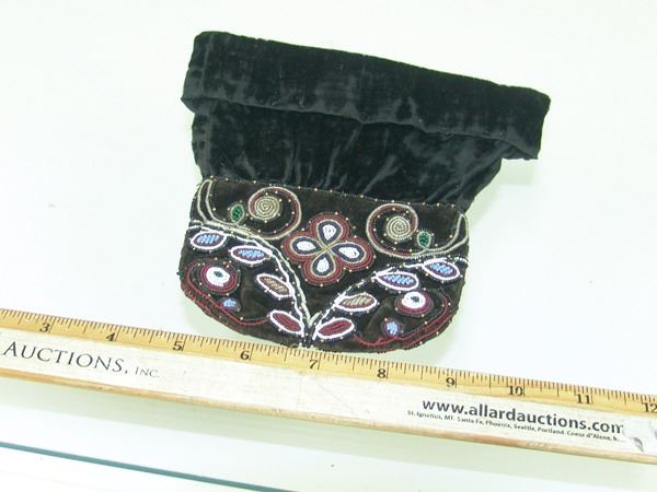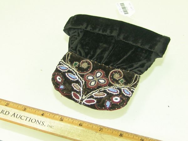 Very fine, brown and black velvet pouch both sides with intricate floral designs done using 22/0 beads, plus a few metallics. Very good condition, an extraordinary example.Early 1900s6-3/4" x 5-1/4"