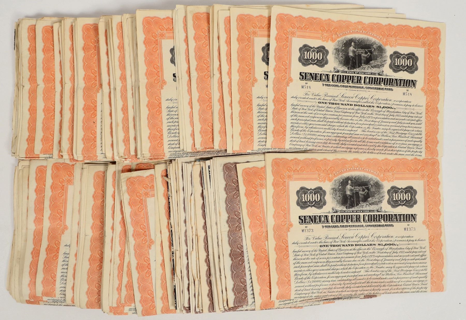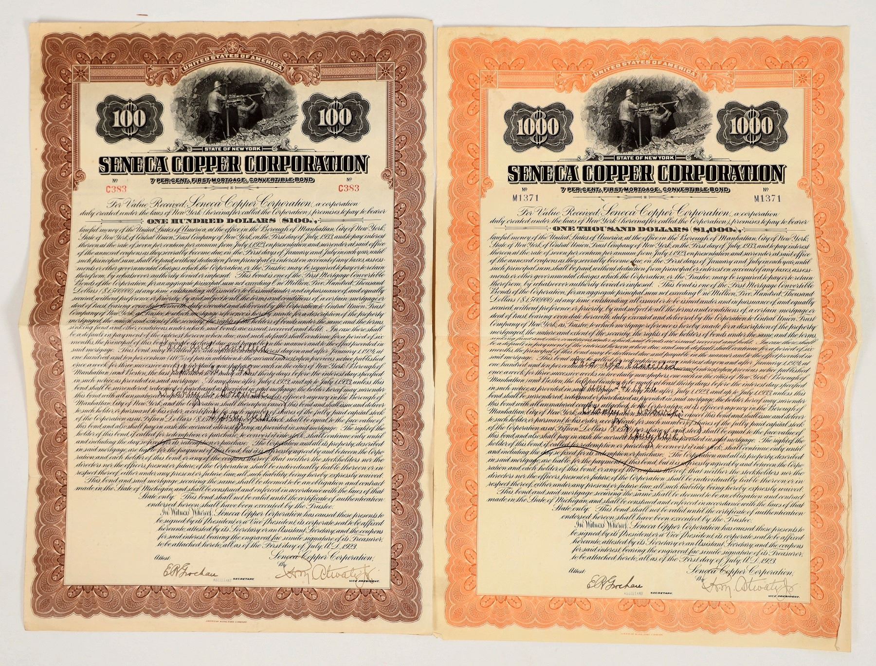 There are over 180 convertible bonds for the Seneca Copper Corporation of New York state issued in 1923. There are 20 bonds with a face value of $100 and over 160 bonds at $1000 value. Please see photo for details. The Seneca Copper Mine is near Eagle River, Michigan in the Keweenaw Copper Mining District. The site was first discovered in 1872. The Seneca Mining Co. was dissolved in Oct. 1918, and all it's stock was conveyed to Seneca Copper Corporation (our company). The mine closed in 1924.