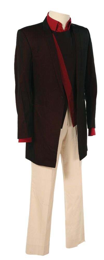 Seneca Crane Suit. Worn by Wes Bentley as Seneca Crane throughout entirety of the movie. Complete hero costume consists of a custom-made three-piece suit which includes a red and black iridescent herringbone jacket, a red and black iridescent herringbone vest with a diagonal closure and a three-inch red contrast band, and a pair of cream voile flat-front slacks. Each suit piece has an individual internal Judianna Makovsky label. Also includes a fire engine red dress shirt made to order by Anto Beverly Hills, a pair of black patent leather side-zip ankle boots, and a pair of black socks. Starting at $800