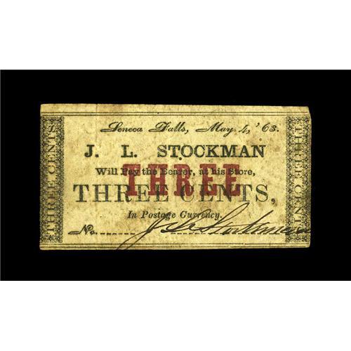<B>Seneca Falls, NY- J.L. Stockman</B></I> 3¢ May 4, 1863 Harris 25<BR>A very scarce note payable in Postage Currency. <B>Fine.</B></I>