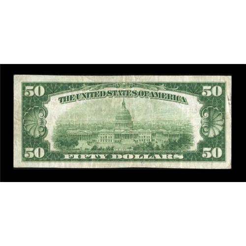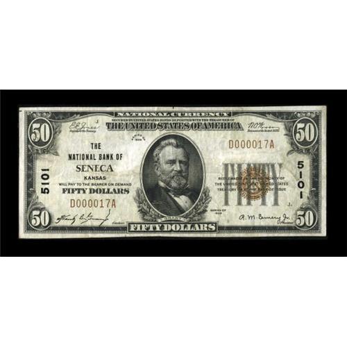 <B>Seneca, KS</B></I> - $50 1929 Ty. 1 <B>The NB of Seneca</B></I> Ch. # 5101<BR> This <B>Very Fine </B></I>$50 comes from a bank that only issued $50s and $100s during the Series 1929 era. Charter number 5101 joins the other 10 banks in the state to have issued this type and denomination.<BR><I>From The J.S. Weber Collection.</B></I><BR><BR><b>Shipping:</b> Coins & Currency (<a target="_blank" href="http://www.heritageauctions.com/common/shipping.php">view shipping information</a>)