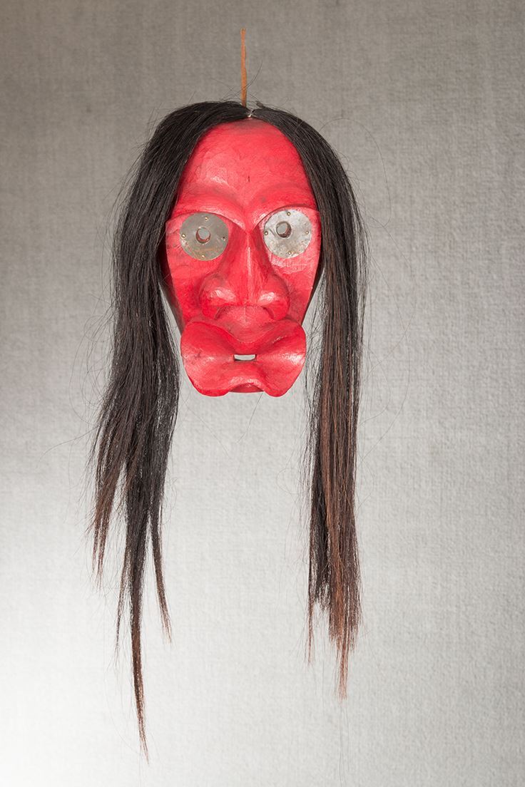 Seneca False Face Mask. Hand-carved and painted. Accented with metal eyes and double spoonmouth blower.