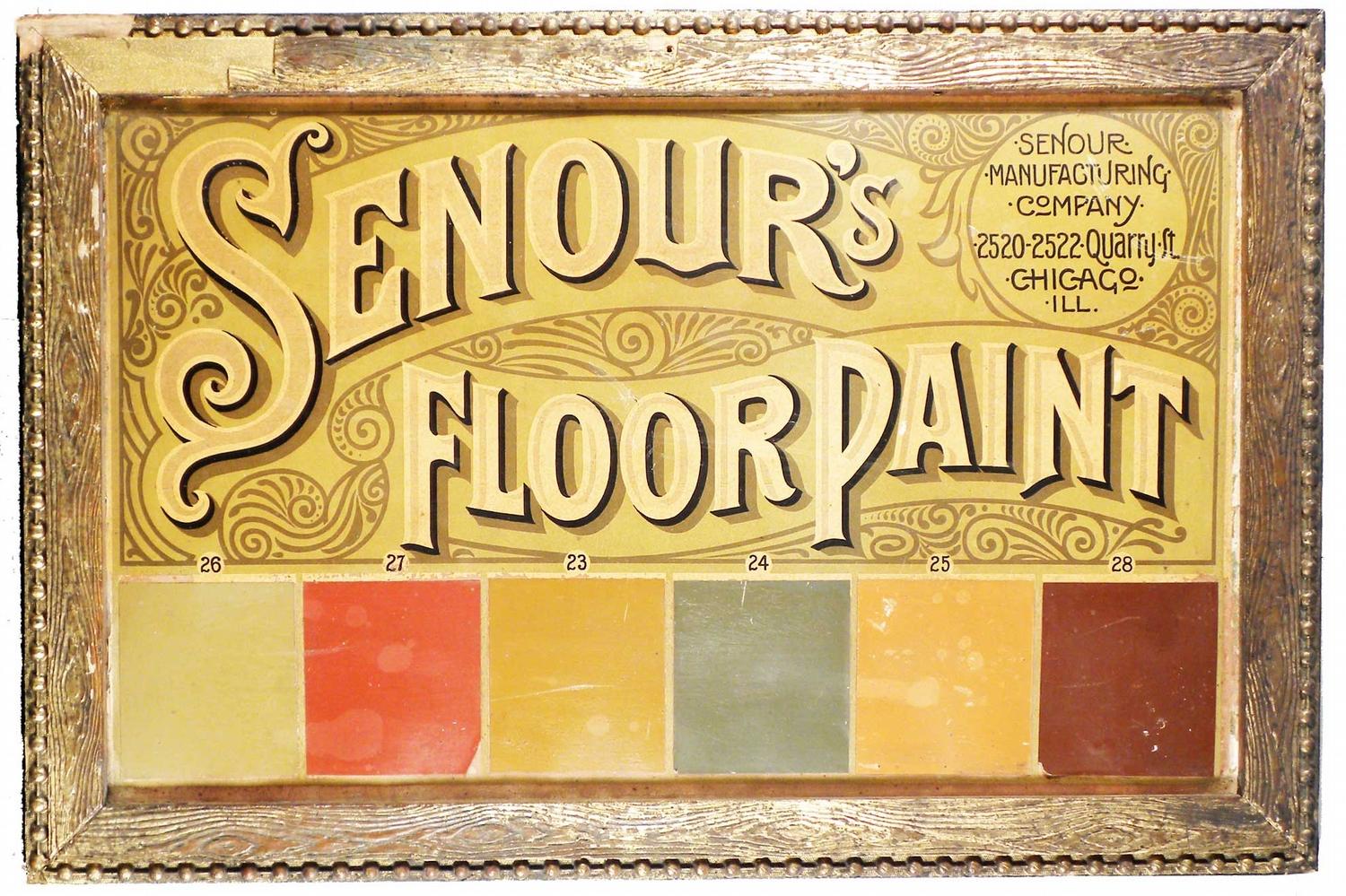 Senour's Floor Paint Light Cardboard Sign. Senour Mfg. Co. Chicago IL. Light staining and paint specs otherwise good condition, gesso frame has damage. 23 X 15 1/2 inches.