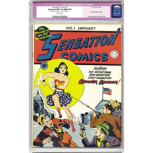 <B>Sensation Comics #1 (DC, 1942) CGC Apparent NM 9.4 Slight (P) Off-white pages.</B></I> You probably won't find a nicer-looking copy of this key issue. This copy's immaculate appearance did get a helping hand from a bit of professional restoration, but it's a fact that unrestored copies of this book invariably have the cover whites marred by a dust shadow or other discoloration, so this may be the copy that most closely approximates the way the book looked when it first graced newsstands in 1942. The issue, listed among the 30 most valuable comics by Overstreet, has the second appearance of Wonder Woman, published just one month after the character was first seen in <B>All Star Comics</B></I> #8. Part Two of Wonder Woman's origin is told for the first time in this comic, with Princess Diana arriving in America. It's also the first time her "Diana Prince" secret identity is used, and we see how she came by that alias. While Wonder Woman was the undisputed star of the issue, a few other DC heroes of note made their debuts: Mr. Terrific, Wildcat, Little Boy Blue and the Blue Boys, and Shelly Moldoff's Black Pirate. The famous cover is the work of Jon Blummer. CGC notes, "Restoration includes: cover cleaned and pressed." Overstreet 2006 GD 2.0 value = $2,660; VG 4.0 value =$5,320; FN 6.0 value = $7,980; VF 8.0 value = $19,950; VF/NM 9.0 value = $34,475; NM- 9.2 value = $49,000.