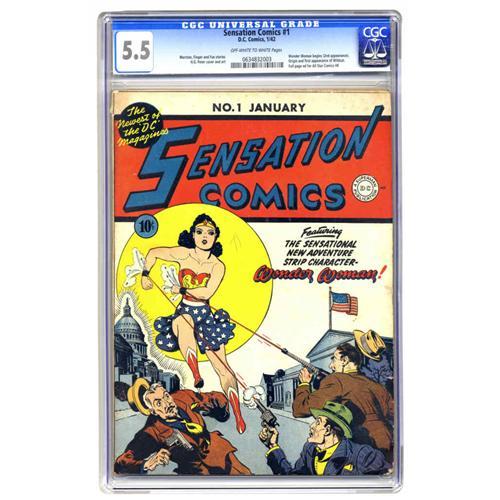 <B>Sensation Comics #1 (DC, 1942) CGC FN- 5.5 Off-white to white pages.</B></I> This issue's listed among the 30 most valuable comics by Overstreet thanks to the second appearance of the number one superheroine in comics, Wonder Woman. The issue came out just one month after the character was first seen in <B>All Star Comics</B></I> #8, and this can be said to be Part Two of Wonder Woman's origin, as it shows her arriving in America for the first time and also introduces her "Diana Prince" secret identity. The story is by the creative team that defined the character in the Golden Age, namely writer William Moulton Marston and artist H. G. Peter. Making their first appearances in this issue were Mr. Terrific and Wildcat, both of whom have had stints with the Justice Society over the years) as well as Little Boy Blue and the Blue Boys, three kid pals who don costumes. There's also the Black Pirate feature by Sheldon Moldoff, which Moldoff reportedly called his personal favorite of the features he drew. The famous cover is the work of Jon Blummer. Overstreet 2005 FN 6.0 value = $7,725. CGC census 8/05: 2 in 5.5, 7 higher.