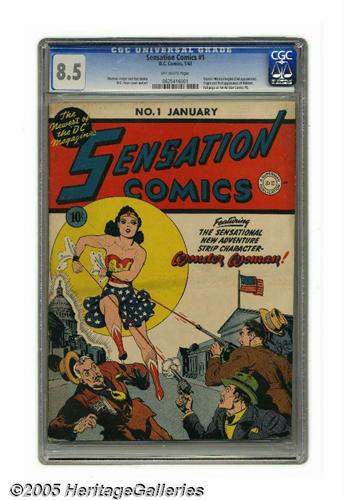 <B>Sensation Comics #1 (DC, 1942) CGC VF+ 8.5 Off-white pages.</B></I> This key comic is listed among the 30 most valuable comics by Overstreet, and our copy is one of the best you'll find. It's the second appearance of the number one superheroine in comics, Wonder Woman, in an issue released just one month after she was first seen in <B>All Star Comics</B></I> #8. Also making their debuts were two other DC heroes of note, neither of whom had super powers but both of whom packed a punch: Mr. Terrific and Wildcat. H. G. Peter drew the Wonder Woman story; the issue's other artists include Sheldon Moldoff, Irwin Hasen, and Howard Purcell. The number of existing copies of this issue is "less than average" according to Gerber. Coupled with Wonder Woman's ever-increasing popularity, that means this book will only become more sought-after with the passage of time. Overstreet 2005 VF 8.0 value = $19,400; VF/NM 9.0 value = $31,700. CGC census 2/05: 2 in 8.5, 2 higher.