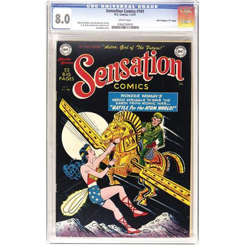 <B>Sensation Comics #101 Davis Crippen ("D" Copy) pedigree (DC, 1951) CGC VF 8.0 White pages.</B></I> A black-cover book in this shape and with this page quality is always something to cherish, but frankly we would have settled for <I>any</B></I> copy of this issue from near the end of Wonder Woman's tenure! The cover art is credited to none other than Joe Kubert. Overstreet 2006 VF 8.0 value = $281. CGC census 6/06: 1 in 8.0, none higher. <I>From the Crippen Collection.</B></I> <BR><BR><B>Important notice:</B> Heritage usually auctions material at the rate of 200-250 lots per hour. On some occasions eBay Live bid software or the Internet may not be able to keep up with the pace of the auction. We recommend placing a realistic absentee bid now as insurance to avoid disappointment. Occasionally the auctioneer may eliminate or reject an eBay Live bid, and the auctioneer may also reopen a lot after the close of the eBay live bidding (usually because we missed an audience bid), and may reject your bid even if it shows you as the winning bidder. By bidding via eBay Live, you agree that Heritage may award the lot to another bidder at its sole discretion under the circumstances described above or any other reasonable circumstances. Since eBay bids are not shown to us until we open the lot on the floor, we treat those bids just like floor bids. In most cases the floor responds before the eBay bid is presented to us, due to Internet lag time, so for consistency we have made it a policy that floor bids are always considered first over tie eBay live bids. Also please note that all Heritage lots purchased through eBay Live carry a 22.5% Buyer's Premium. Please make sure you read the Terms and Conditions before you bid. This lot is being auctioned in conjunction with a live floor auction by Heritage Auction Galleries. All final auction and invoice information will be supplied by Heritage Auction Galleries, and all other information should be considered preliminary. Lot:41001 <BR><BR><B>Winning Notification and Billing:</B> After the FINAL session in this auction is complete, Heritage will send e-mail and snail mail invoices. This process normally takes several days. All final auction and invoice information will be supplied by Heritage Auction Galleries, and all other information should be considered preliminary. <BR><BR>This auction will be conducted on a live auction floor and over the Internet through eBay Live. If you choose to place an absentee bid, please take a moment to <font color='#0000ff'><u><a href='http://pages.ebay.com/liveauctions/help/before/laabsentee.html'>learn how eBay Live absentee bidding works</a></u></font><font color='#000000'>