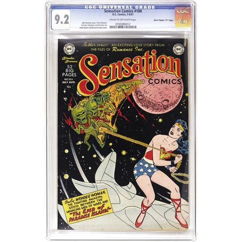 <B>Sensation Comics #104 Davis Crippen ("D" Copy) pedigree (DC, 1951) CGC NM- 9.2 Cream to off-white pages.</B></I> This black cover issue has Wonder Woman roping up the "Menacing Men of Mars". A Romance Inc. story also appears. The dark cover obviously kept many copies from surviving in high grade as you can see from the current CGC census. This issue holds the single highest grade by quite a margin as the next closest copy is a mere 6.0. Irwin Hasen and Bernard Sachs provide the cover art while Sachs and Carmine Infantino treat us to the interiors. Overstreet 2006 NM- 9.2 value = $600. CGC census 7/06: 1 in 9.2, none higher. <I>From the Crippen Collection.</B></I> <BR><BR><B>Important notice:</B> Heritage usually auctions material at the rate of 200-250 lots per hour. On some occasions eBay Live bid software or the Internet may not be able to keep up with the pace of the auction. We recommend placing a realistic absentee bid now as insurance to avoid disappointment. Occasionally the auctioneer may eliminate or reject an eBay Live bid, and the auctioneer may also reopen a lot after the close of the eBay live bidding (usually because we missed an audience bid), and may reject your bid even if it shows you as the winning bidder. By bidding via eBay Live, you agree that Heritage may award the lot to another bidder at its sole discretion under the circumstances described above or any other reasonable circumstances. Since eBay bids are not shown to us until we open the lot on the floor, we treat those bids just like floor bids. In most cases the floor responds before the eBay bid is presented to us, due to Internet lag time, so for consistency we have made it a policy that floor bids are always considered first over tie eBay live bids. Also please note that all Heritage lots purchased through eBay Live carry a 22.5% Buyer's Premium. Please make sure you read the Terms and Conditions before you bid. This lot is being auctioned in conjunction with a live floor auction by Heritage Auction Galleries. All final auction and invoice information will be supplied by Heritage Auction Galleries, and all other information should be considered preliminary. Lot:41001 <BR><BR><B>Winning Notification and Billing:</B> After the FINAL session in this auction is complete, Heritage will send e-mail and snail mail invoices. This process normally takes several days. All final auction and invoice information will be supplied by Heritage Auction Galleries, and all other information should be considered preliminary. <BR><BR>This auction will be conducted on a live auction floor and over the Internet through eBay Live. If you choose to place an absentee bid, please take a moment to <font color='#0000ff'><u><a href='http://pages.ebay.com/liveauctions/help/before/laabsentee.html'>learn how eBay Live absentee bidding works</a></u></font><font color='#000000'>