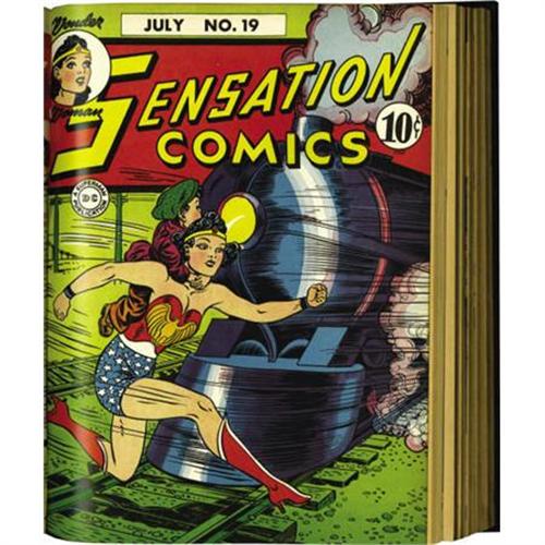 <B>Sensation Comics #13-24 File Copy Bound Volume (DC, 1943).</B></I> Here's the second year of the title that Wonder Woman called home, not to mention the Black Pirate, Mr. Terrific, and Wildcat. The volume consists of trimmed and bound file copies of issues #13 through 24, and kicks off with issue #13's great bowling cover, which featuring Hitler, Tojo, and Mussolini as pin-heads! This cover has a very small amount of binding damage on the front cover, while the other covers mostly look fresh and new. The paper is cream to off-white for the most part, and still supple. Overstreet 2007 VG 4.0 value for group = $2,024.<BR><BR><b>Shipping:</b> Books & Catalogs (<a target="_blank" href="http://www.heritageauctions.com/common/shipping.php">view shipping information</a>)