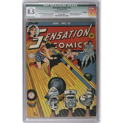 <B>Sensation Comics #13 (DC, 1943) CGC Qualified VF+ 8.5 Off-white to white pages.</B></I> Hitler, Tojo, and Mussolini appear on the cover. H. G. Peter, Sheldon Moldoff, and Irwin Hasen art. CGC notes, "Coupon cut out of back cover. Incomplete." Overstreet 2006 GD 2.0 value = $141; VG 4.0 value = $242; FN 6.0 value = $423; VF 8.0 value = $881; VF/NM 9.0 value = $1,391. <I>From the Collection of Harold Curtis.</B></I>