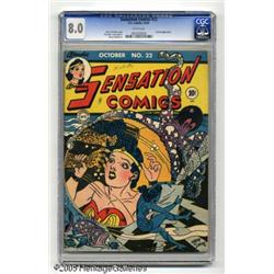 <B>Sensation Comics #22 (DC, 1943) CGC VF 8.0 White pages.</B></I> Priscilla Rich was your average wealthy society girl, until the day she got jealous of the attention paid to Wonder Woman. <I>How</B></I> jealous? Try "go-insane-and-turn-to-crime" jealous. She's known as the Cheetah, and you can see her paws on this issue's bizarre cover, which showcases the distinctive style of H. G. Peter. The book's interior art is by Peter and Sheldon Moldoff. This is the highest-graded copy of this issue that CGC has certified to date. Overstreet 2004 VF 8.0 value = $475. CGC census 12/04: 1 in 8.0, none higher.