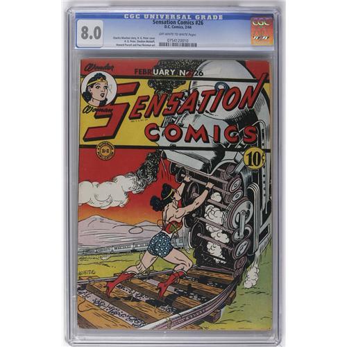 <B>Sensation Comics #26 (DC, 1944) CGC VF 8.0 Off-white to white pages.</B></I> This attractive copy's tied for the highest grade that CGC has assigned as of this writing. Wonder Woman, written by William Moulton Marston (under his pen name Charles Moulton) and drawn by H. G. Peter, is joined by a host of backup features. Note that a small plastic stabilizing peg is loose inside the CGC holder, not affecting the comic itself or the integrity of the holder. Overstreet 2006 VF 8.0 value = $488. CGC census 3/06: 3 in 8.0, none higher. <I>From the Collection of Harold Curtis.</B></I>