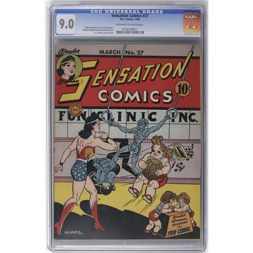 <B>Sensation Comics #27 (DC, 1944) CGC VF/NM 9.0 Off-white to white pages.</B></I> This sterling copy is sure to please. The issue features Wonder Woman's Fun Clinic, the upbeat sentiments of which were surely welcome during wartime (writer William Moulton Marston made no bones about his intention to use the Wonder Woman stories to help bring about societal change). H. G. Peter drew the cover and the accompanying story. Overstreet 2006 VF/NM 9.0 value = $769; NM- 9.2 value = $1,050. CGC census 3/06: 2 in 9.0, none higher. <I>From the Collection of Harold Curtis.</B></I>