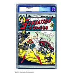 Sensation Comics #28 (DC, 1944) CGC VF- 7.5 Off-white to white pages. H. G. Peter's Wonder Woman always seemed to have the situation well in hand. Her calm expression belied the brute force she commanded, in this case, transferred to her trusty lasso. This is a very pretty copy with only minor detractions keeping it technically at the CGC-assigned grade, which just happens to represent the highest grade given out to an issue #28 to date. Overstreet 2002 VF 8.0 value = $469. Important notice: We expect to be auctioning lots at the rate of 200-250 per hour. Sometimes eBay Premier live bid software cannot keep up with that pace, so we strongly recommend that you place a realistic proxy bid now as insurance to avoid disappointment. Also please note that all Heritage/CAA lots purchased through eBay Premier carry a 20% Buyer's Premium. Please make sure you read the Terms and Conditions.