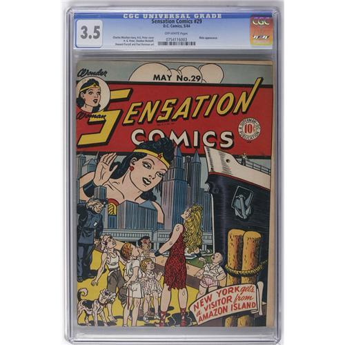 <B>Sensation Comics #29 (DC, 1944) CGC VG- 3.5 Off-white pages.</B></I> H. G. Peter cover. Peter and Sheldon Moldoff art. Overstreet 2006 VG 4.0 value = $156. CGC census 2/06: 1 in 3.5, 7 higher. <I>From the Collection of Harold Curtis.</B></I>