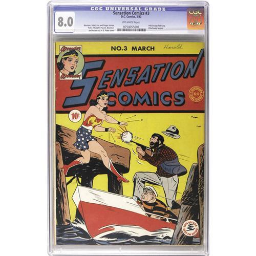 <B>Sensation Comics #3 (DC, 1942) CGC VF 8.0 Off-white pages.</B></I> Etta Candy's second appearance sees the plus-size gal receive a "mental radio" from Wonder Woman, which the amazing Amazon can activate through telepathy (a device used often in later stories). Irwin Hasen handled cover art chores in addition to drawing the Wildcat feature. The Wonder Woman story was drawn by the character's regular artist, H. G. Peter. Overstreet 2006 VF 8.0 value = $1,756. CGC census 12/06: 1 in 8.0, 1 higher.<BR><BR><b>Shipping:</b> Slabbed Comic (<a target="_blank" href="http://www.heritageauctions.com/common/shipping.php">view shipping information</a>)