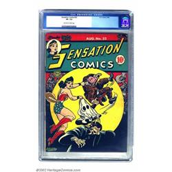 Sensation Comics #32 (DC, 1944) CGC VF- 7.5 Off-white to white pages. H. G. Peter continued coming up with unique covers for comicdom's main woman, even with the demands made by both her headlining books, Sensation Comics and Wonder Woman. This copy could easily be mistaken for a higher grade, and only one other copy has been graded higher of the issue by CGC to date. Overstreet 2002 VF 8.0 value = $341. Important notice: We expect to be auctioning lots at the rate of 200-250 per hour. Sometimes eBay Premier live bid software cannot keep up with that pace, so we strongly recommend that you place a realistic proxy bid now as insurance to avoid disappointment. Also please note that all Heritage/CAA lots purchased through eBay Premier carry a 20% Buyer's Premium. Please make sure you read the Terms and Conditions.