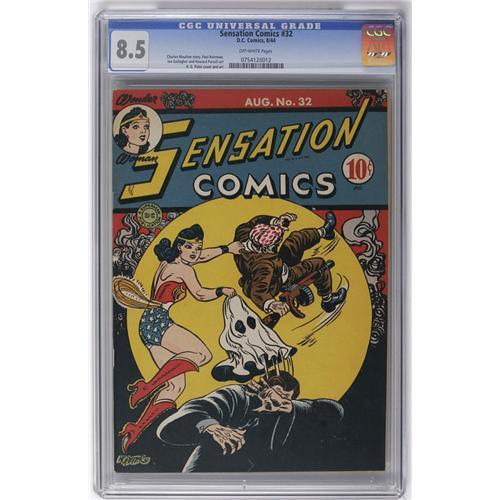 <B>Sensation Comics #32 (DC, 1944) CGC VF+ 8.5 Off-white pages.</B></I> The term "highest-graded" is appearing over and over on these pages, so you can see why we're so excited about this <B>Sensation</B></I> run. Wonder Woman is joined in this issue by Little Boy Blue, the Gay Ghost, Mr. Terrific, and Wildcat. The cover is by H. G. Peter. Overstreet 2006 VF 8.0 value = $350; VF/NM 9.0 value = $555. CGC census 3/06: 2 in 8.5, none higher. <I>From the Collection of Harold Curtis.</B></I>