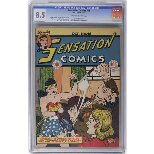 <B>Sensation Comics #46 (DC, 1945) CGC VF+ 8.5 Off-white to white pages.</B></I> "Some girls <I>Iove</B></I> to have a man stronger than they are to make them do things," thinks Wonder Woman in this issue, "But -- isn't it more fun to make the man obey?" And don't you want to buy this comic after reading that? <I>Hey</B></I> now! Steve Trevor and Wonder Woman explore gender roles in a tale written by William Moulton Marston and drawn by H. G. Peter. Overstreet 2006 VF 8.0 value = $293; VF/NM 9.0 value = $459. CGC census 3/06: 4 in 8.5, 2 higher. <I>From the Collection of Harold Curtis.</B></I>
